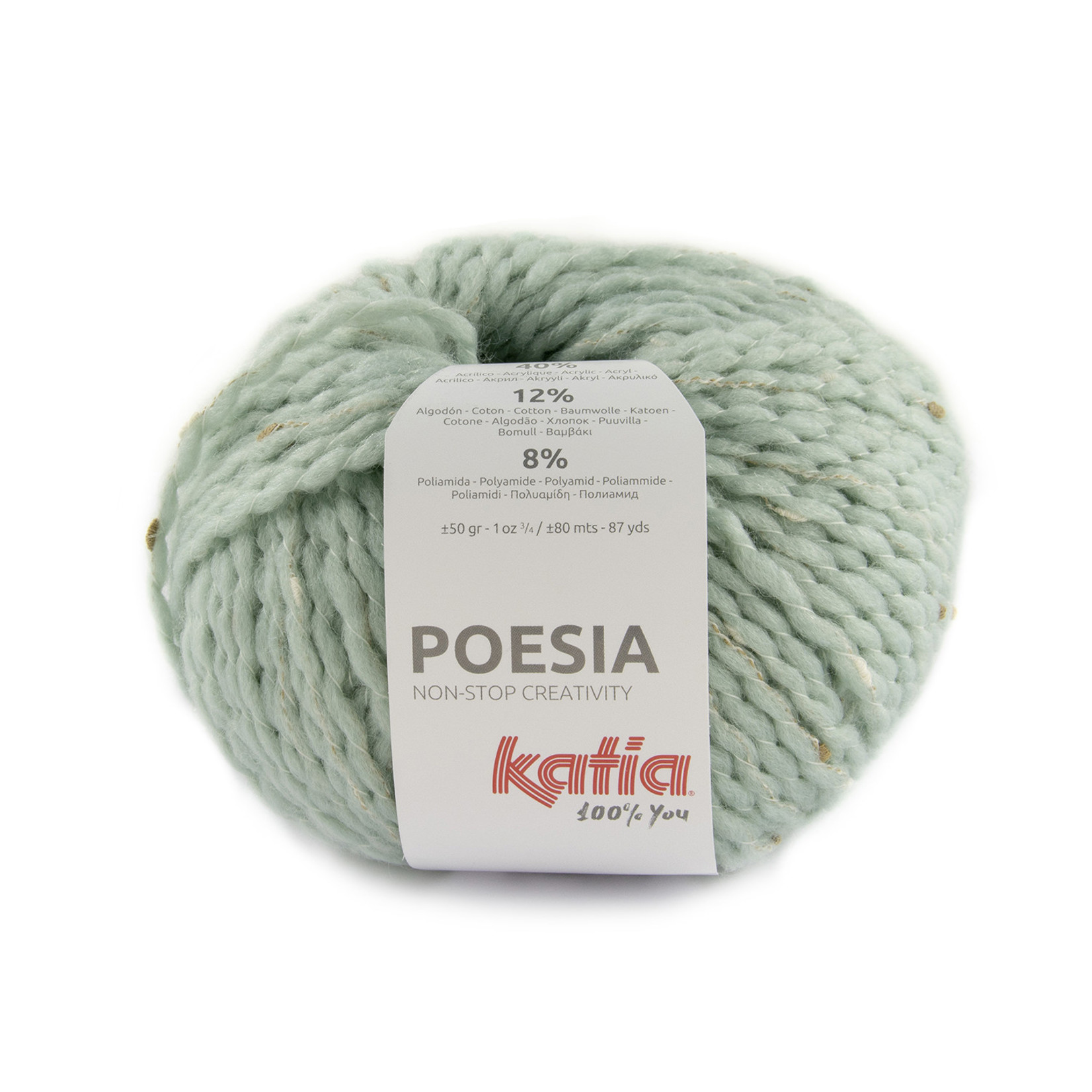 Katia Poesia 54 Lichtgroen is een fantasiegaren met een lontachtige structuur met een katoenen draad omringd. Door de hele bol heen zie je bovendien subtiele spikkels die het breiwerk een tweed-achtige toets geven.