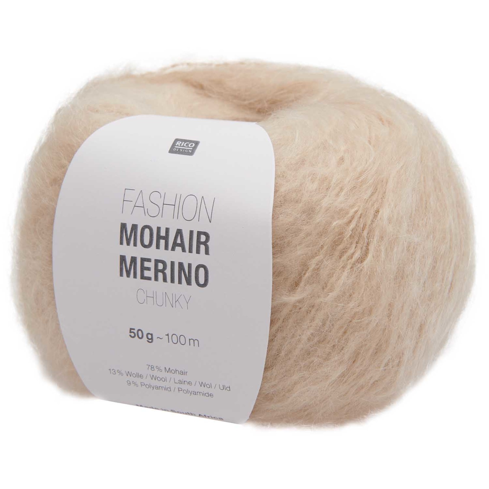 Rico Fashion MMohair Merino Chunky 012 Ecru is een comfortabel en pluizig garen gemaakt van mohair, wol en polyamide. Het garen heeft een dunne getwijnde draad en voelt heerlijk zacht aan. Maak met dit garen de mooiste truien, vesten en sjaals voor de winter.